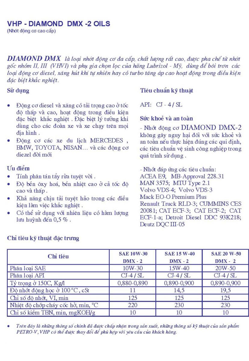 Sản phẩm, hàng hóa Dầu mỡ nhớt VHP - MP.... Dầu động cơ cao cấp VHP - DIAMOND DMX -2 oils